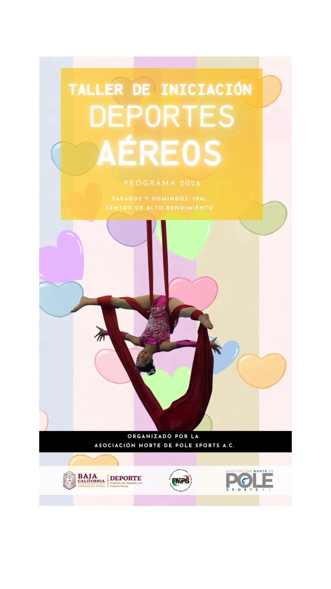 Sábados y Domingos de 1:00 p.m. a 3:00 p.m. Aro, telas y pole aéreo para niñas, niños, adolescentes y adultos.